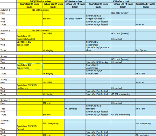 Our extra curricular provision changes each term so that all children are given opportunities to engage with a wide range of clubs throughout the course of the school year. In addition to what is set out below, through our engagement with the Schools' Sports Partnership, seasonal clubs are also offered which align with local events/competitions which we take part in. Further details can be found within 'curriculum, PE'.