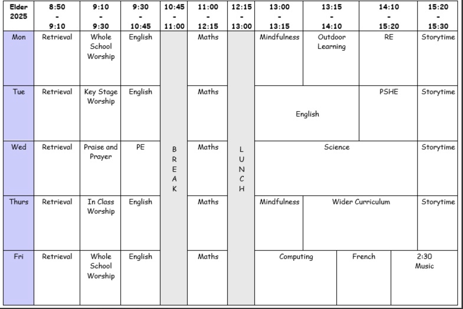 Below is a copy of the year 5 timetable.